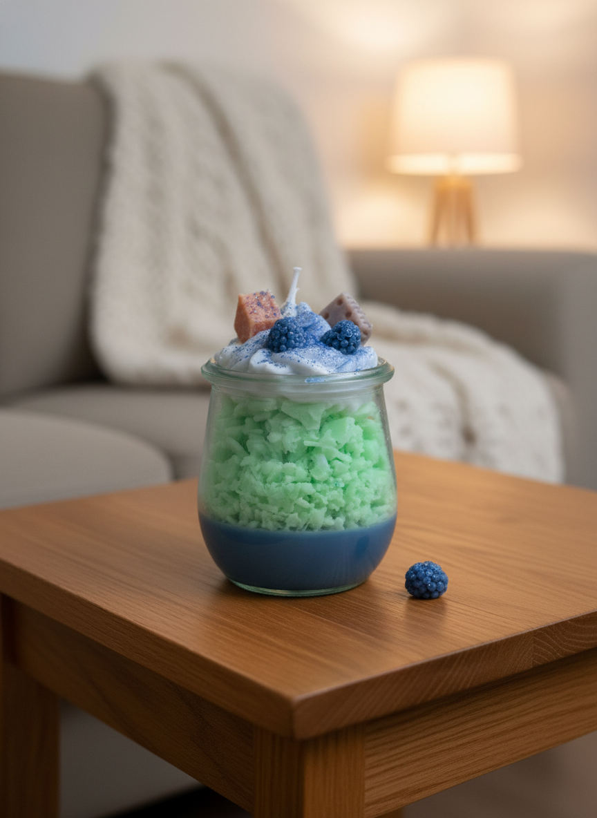 Gönnen Sie sich einen besonderen Wohlfühlmoment: Diese handgemachte Duftkerze sorgt für entspannte Atmosphäre und erinnert an den Genuss eines sommerlichen Desserts. Das Glas ist liebevoll mit farbenfrohen Wachselementen dekoriert – ein echter Hingucker für Ihr Zuhause oder als stilvolle Geschenkidee. Gefertigt aus 100% veganem Sojawachs und mit einem Docht aus Baumwolle überzeugt sie durch nachhaltige Qualität und lange Brenndauer. Der Duft je nach Wahl – fruchtig, frisch oder cremig: je nach Wahl – fruchtig, frisch oder cremig. Egal welche Duftwahl – eine hochwertige Premium-Note, die begeistert. Ca. 170g · Brenndauer